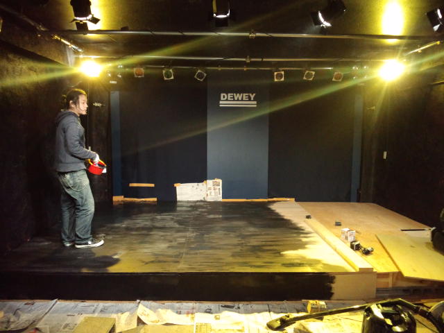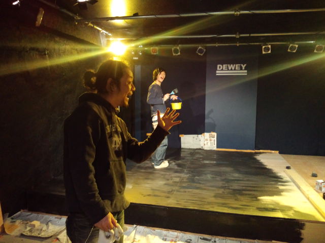 で、夜に、ライブハウスのデューイにちょいと立ち寄り。現在、デューイではステージを高くする改装の真っ最中なんです。これでステージも見やすくなって、演奏するバンドも観る側のお客さんも大喜びですね!牧野さん、谷川さん、ファイトでございますよ~。ああ、ヨコシマンズも早くライブしたい!